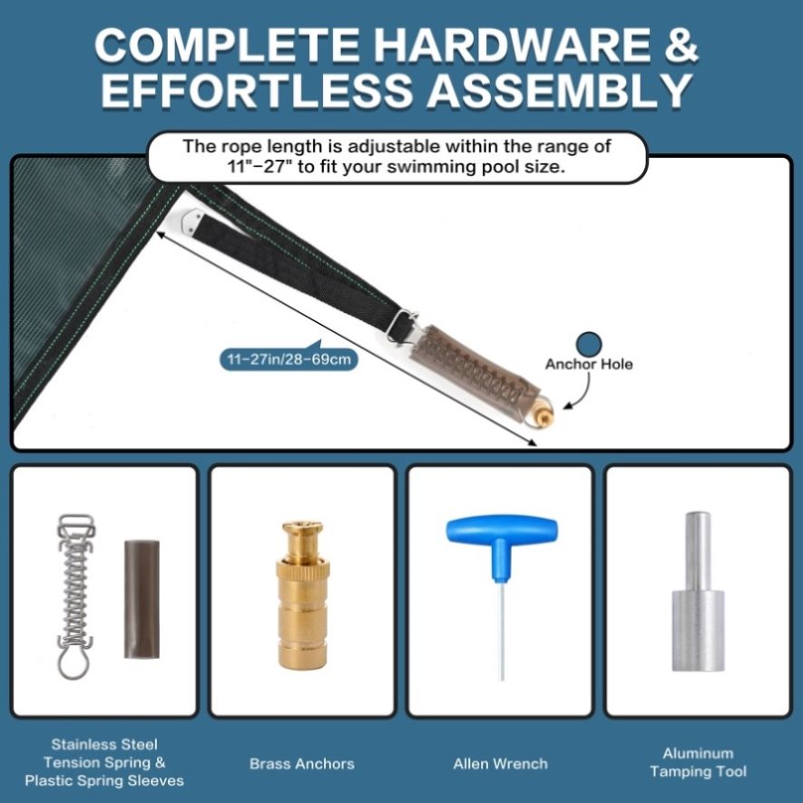 All accessories are ready to use out of the box: This kit includes brass anchor bolts, stainless steel springs and all necessary installation tools. Compatible with hard pool banks such as concrete and stone, adjustable rope length, suitable for 90% of underground swimming pool structures. The three-step installation method of "measurement - drilling - tensioning" can be completed by a single person.