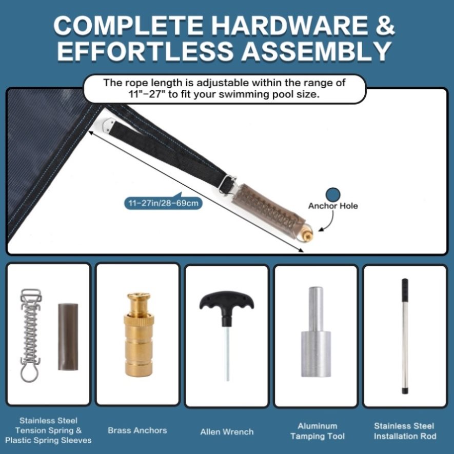 All accessories are ready to use out of the box: This kit includes brass anchor bolts, stainless steel springs and all necessary installation tools. Compatible with hard pool banks such as concrete and stone, adjustable rope length, suitable for 90% of underground swimming pool structures. The three-step installation method of "measurement - drilling - tensioning" can be completed by a single person.