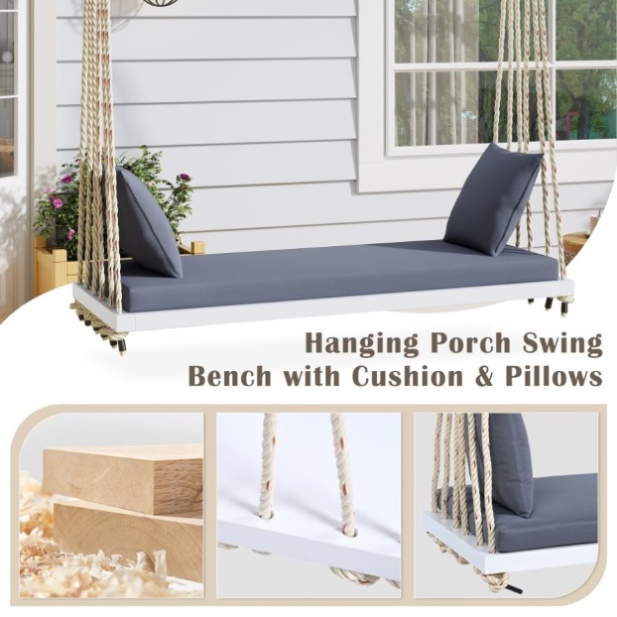 | Summary | Relax in style with this premium Acacia wood swing chair. Designed for comfort and durability, it features a spacious 63Lx23.6W inch seat with a soft cushion and two cozy pillows. The swing is supported by six strong hemp ropes, each measuring 10.8 feet, with a 400lbs weight capacity. Available in five colors, it's perfect for your garden, backyard, patio, or lawn. Enjoy easy setup with 30-minute assembly(2 persons) and transform your outdoor space into a serene retreat. |