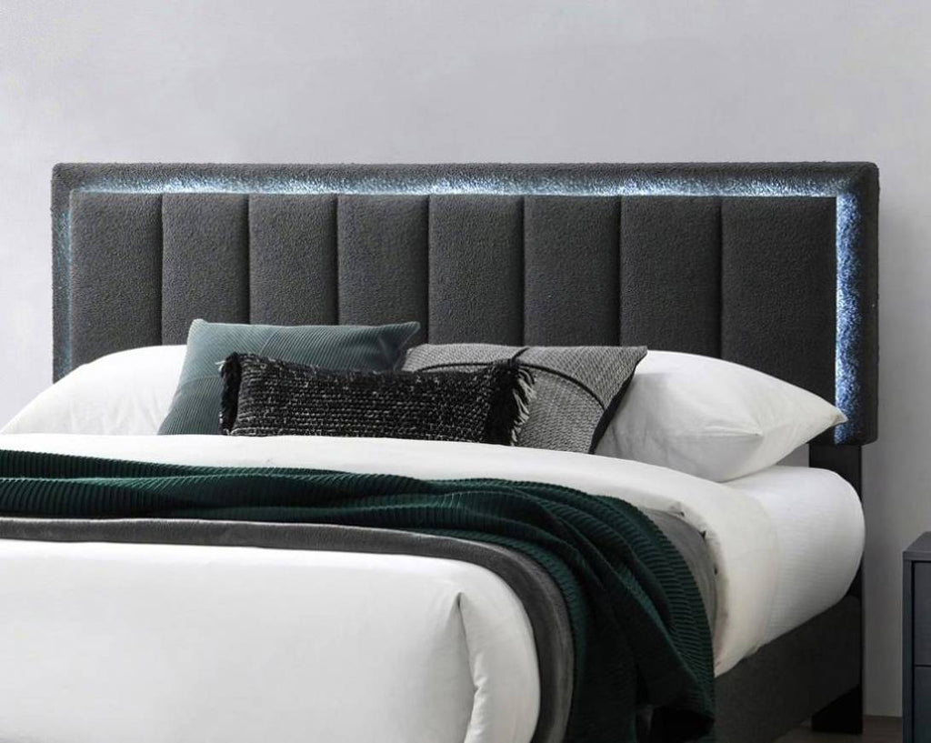 This product features a modern headboard design with built-in LED lights providing added style and functionality.