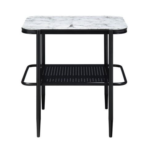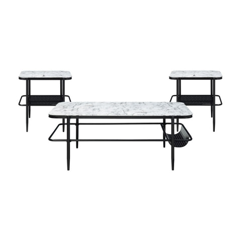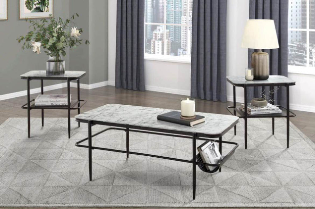 Enhance your living space with this stylish Martine 3-piece occasional table set. Featuring marble print tempered fluted glass tops, this set delivers both elegance and durability. The sleek black-finished metal base adds a contemporary touch, perfect for modern homes. Whether you're using it to showcase décor or as a functional surface, these tables provide versatility for your living room, office, or any space. Each table features shelves or side storage for magazines and remotes. Ideal for those seeking to blend chic aesthetics with practical design.