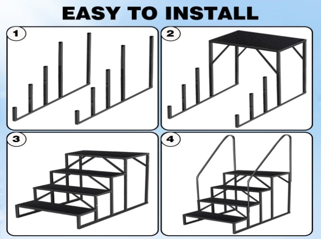 【Easy to Install Portable Stairs】It is easy to install mobile home steps, without any special tools or equipment. The package includes the necessary wrenches and screws, and porch steps accessories. Please note that the screws must be tightened with your RV steps with handrail so that the load-bearing capacity of the ladder is as expected.