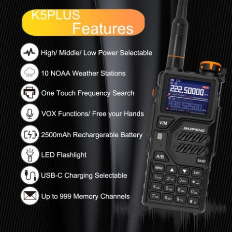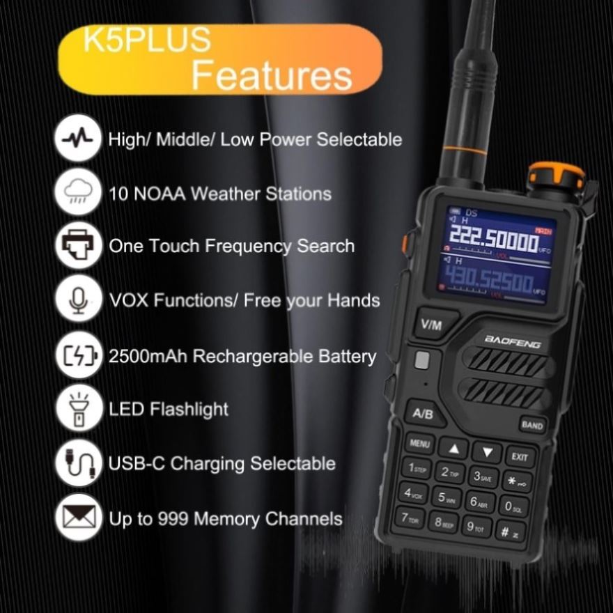 • Upgraded UV-5R : K5PLUS is an upgraded version of UV-5R, with high/medium/low power switching.