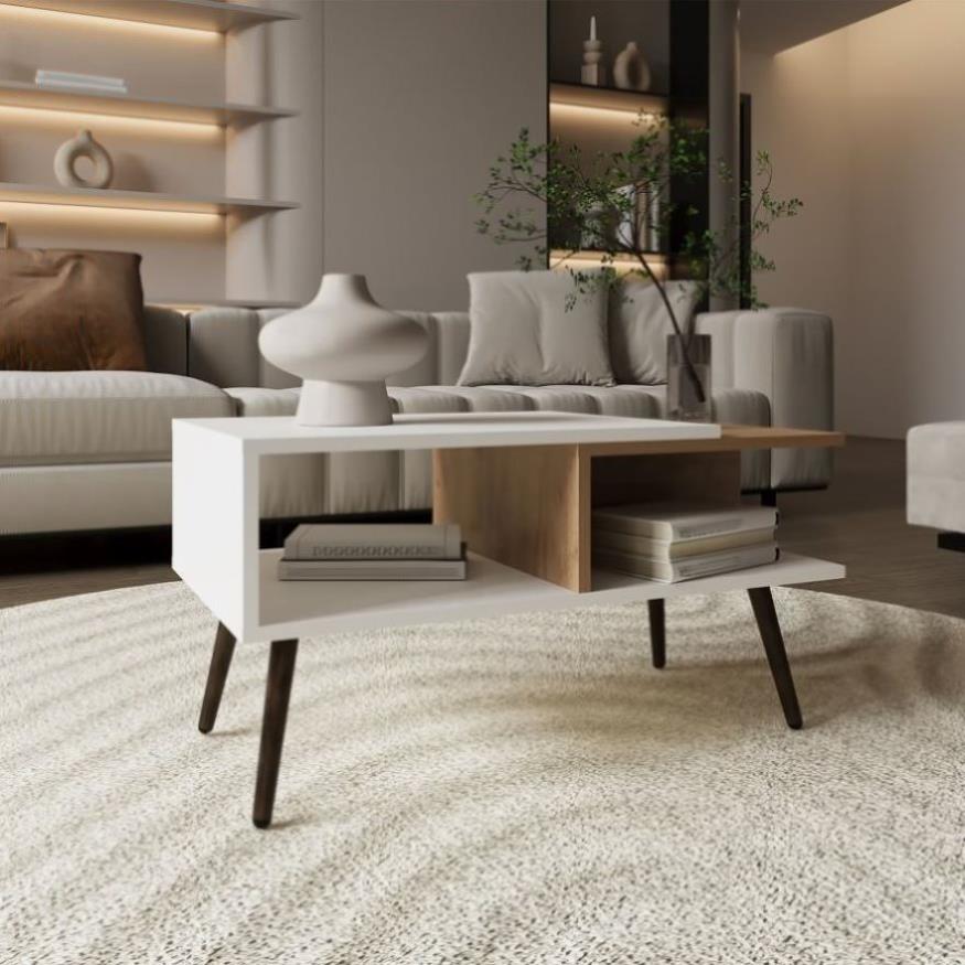 Coffee Table, 2 Shelves, 4 legs, White / Natural Oak B097P262371