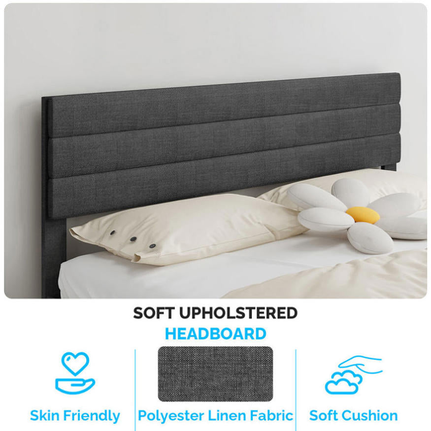 Premium Linen-Like Upholstery + Horizontal Stripe Design: Crafted with high-quality, breathable linen-like polyester fabric in deep gray, it offers a soft texture and luxurious, wrinkle-resistant finish. The headboard’s neatly stitched horizontal stripes and subtle tufting add depth, while the dark hue hides minor stains for easy maintenance.