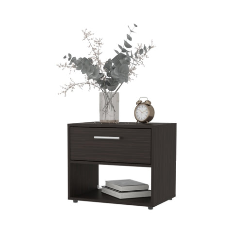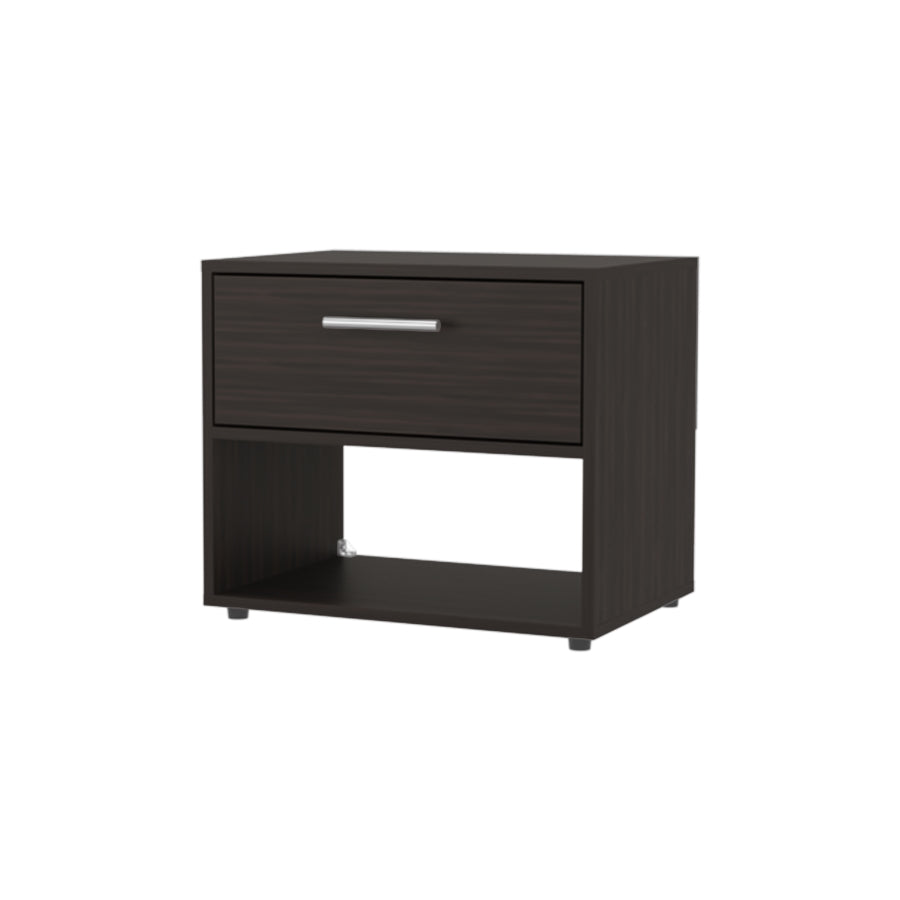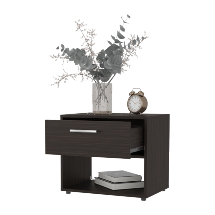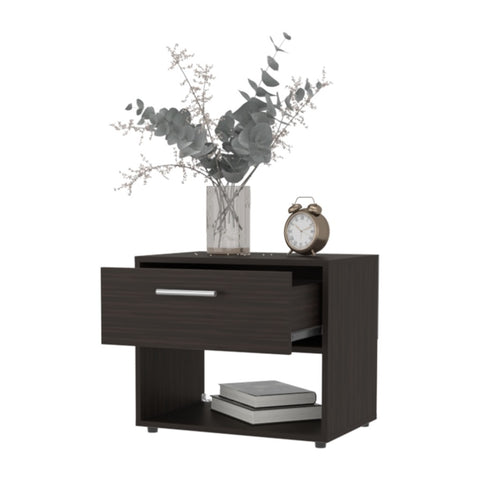 "Elegant nightstand with a modern and functional design, perfect for complementing any bedroom. It features a spacious drawer that provides closed storage to keep your belongings organized and out of sight, while the open bottom shelf is ideal for books, magazines, or decorative items. Materials: Particle board and melamine. Dimensions: 18.1"" (H) x 20.9"" (W) x 14,7"" (D)."""