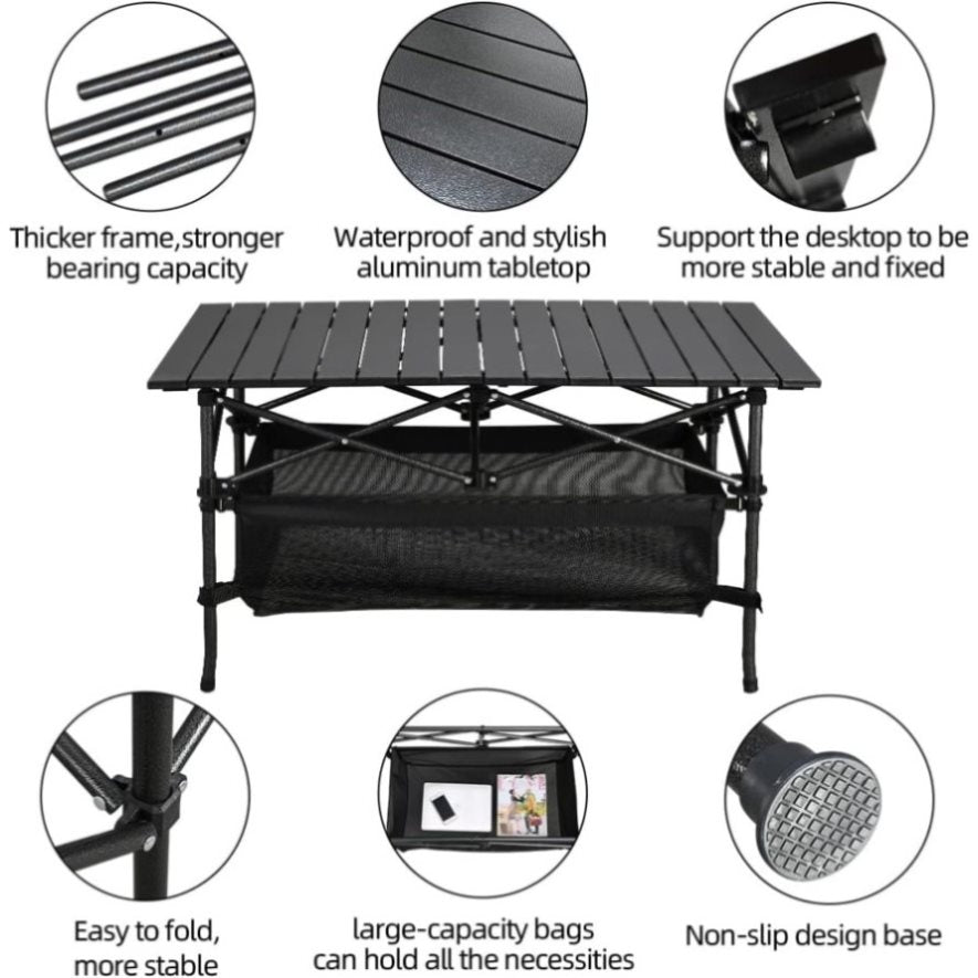 Lightweight and Portable Design: This camping table is made of lightweight aluminum, allowing for effortless transportation. It folds up neatly and comes with an easy-carrying bag, making it perfect for various outdoor activities such as camping, backyard BBQs, beach outings, and picnics. You can take it anywhere without adding much burden. For example, it's a breeze to carry it on a hiking trip or to a campsite by the river. Versatile Usage: Whether you're hosting a party on your patio, enjoying a picnic in the park, or having a barbecue in your backyard, this folding table is your reliable companion. It's also suitable for indoor use, providing an extra surface for your needs. Imagine using it to set up your snacks during a movie night at home or as a workspace in your study. Sturdy and Durable Construction: Crafted from high-quality aluminum, this roll-up table is built to last. It can withstand the rigors of outdoor environments and frequent use. The stable structure ensures that it won't wobble or collapse, giving you a secure surface for placing your items. Even when exposed to different weather conditions, it maintains its integrity. Medium Size for Convenience: The medium-sized design of this table offers just the right amount of space for your essentials. It's large enough to hold your food, drinks, and utensils during a picnic, yet compact enough to fit easily in your car or storage area. You'll find it to be the ideal size for both small and medium-sized gatherings. Easy to Set Up and Fold: Setting up and folding this table is a breeze. With its simple and intuitive design, you can have it ready for use in no time. When it's time to pack up, it folds quickly and fits snugly into the carrying bag. Say goodbye to complicated assembly processes and hello to hassle-free convenience. Lightweight and Portable Design: This camping table is made of lightweight aluminum, allowing for effortless transportation. It folds up neatly and comes with an easy-carrying bag, making it perfect for various outdoor activities such as camping, backyard BBQs, beach outings, and picnics. You can take it anywhere without adding much burden. For example, it's a breeze to carry it on a hiking trip or to a campsite by the river. Versatile Usage: Whether you're hosting a party on your patio, enjoying a picnic in the park, or having a barbecue in your backyard, this folding table is your reliable companion. It's also suitable for indoor use, providing an extra surface for your needs. Imagine using it to set up your snacks during a movie night at home or as a workspace in your study. Sturdy and Durable Construction: Crafted from high-quality aluminum, this roll-up table is built to last. It can withstand the rigors of outdoor environments and frequent use. The stable structure ensures that it won't wobble or collapse, giving you a secure surface for placing your items. Even when exposed to different weather conditions, it maintains its integrity. Medium Size for Convenience: The medium-sized design of this table offers just the right amount of space for your essentials. It's large enough to hold your food, drinks, and utensils during a picnic, yet compact enough to fit easily in your car or storage area. You'll find it to be the ideal size for both small and medium-sized gatherings. Easy to Set Up and Fold: Setting up and folding this table is a breeze. With its simple and intuitive design, you can have it ready for use in no time. When it's time to pack up, it folds quickly and fits snugly into the carrying bag. Say goodbye to complicated assembly processes and hello to hassle-free convenience.