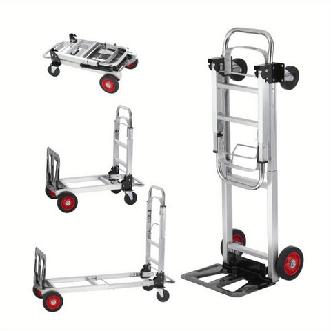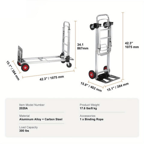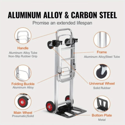 Folding Hand Truck with 2-in-1 Aluminum & Carbon Steel Design – Effortlessly converts between hand truck and platform cart modes without tools, supporting 250-400 lbs. Featuring corrosion-resistant construction, ergonomic design, and smooth-rolling rubber wheels, this heavy-duty dolly excels in warehouses, supermarkets, offices, and homes.