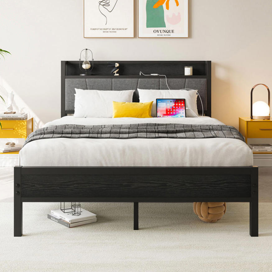 The bed headboard is built-in with 2 outlets and 2 USB. Convenient for you to place iPhone/Android and other devices on it. The bed frame with a storage shelf helps you easy to find your phone, turn off the alarm clock, and get stuff you need while enjoyably lying on the bed.
