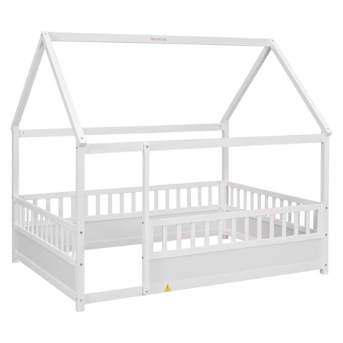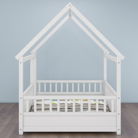 Full Size Floor Wooden Bed with House Roof Frame, Fence Guardrails,White W1858123986
