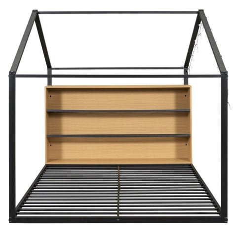 Full Size Metal Bed House Bed Frame with Shelves and Lights, Black N737P176706B