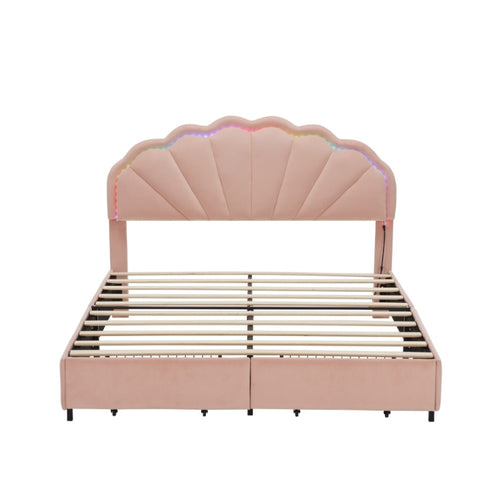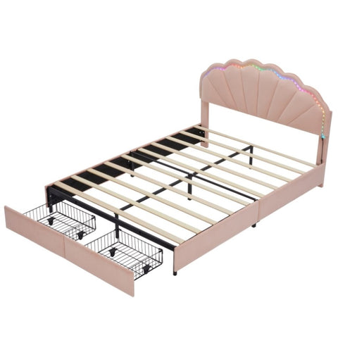 Full Size Upholstered Smart LED Bed Frame with 2 Storage Drawers and Chic Double Petal Headboard , W3004P230608