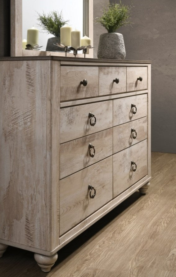 The industrial chic style of the Imerland Contemporary White Wash Finish Bedroom Set remakes your bedroom with contemporary cool. Designer details include antique bronze metal pulls in the front of the drawers, and the wood patch pattern on the top of the cases. Solid hardwoods with a white-wash rustic finish provide long-lasting quality construction. Luxurious touches of bun feet, bronze finished metal accents, wood framed mirror.