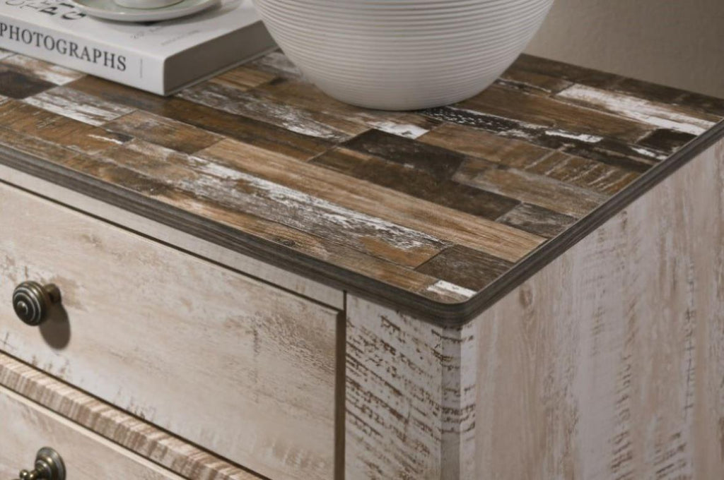 The top of the cases features a patched wood pattern design with distressed antique walnut brown colors.