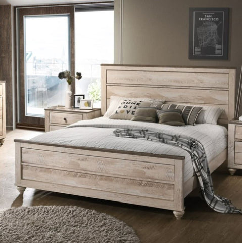 Rustic, urban chic style bedroom set with white wash finish.