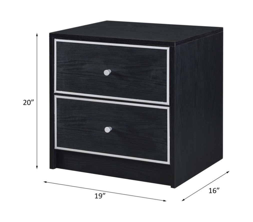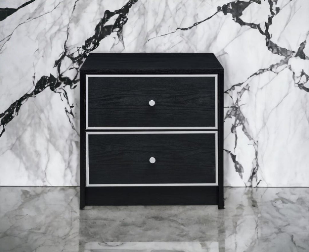 This stylish accent table features a sleek black finish, enhanced by silver-colored line accents on the front of both metal slide drawers, adding a touch of elegance to its design.