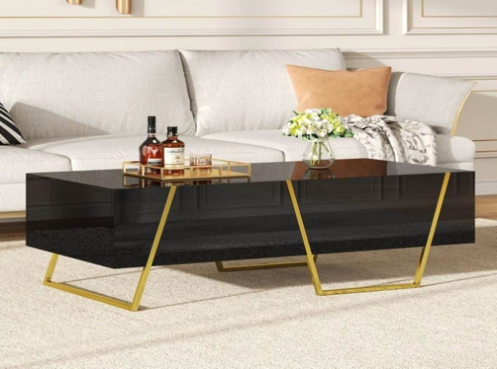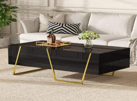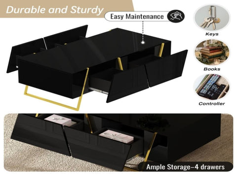 A modern 47.2" rectangular coffee table with a sleek black top, gold base, four spacious drawers for storage, and a durable build, adding luxury and functionality to contemporary spaces.