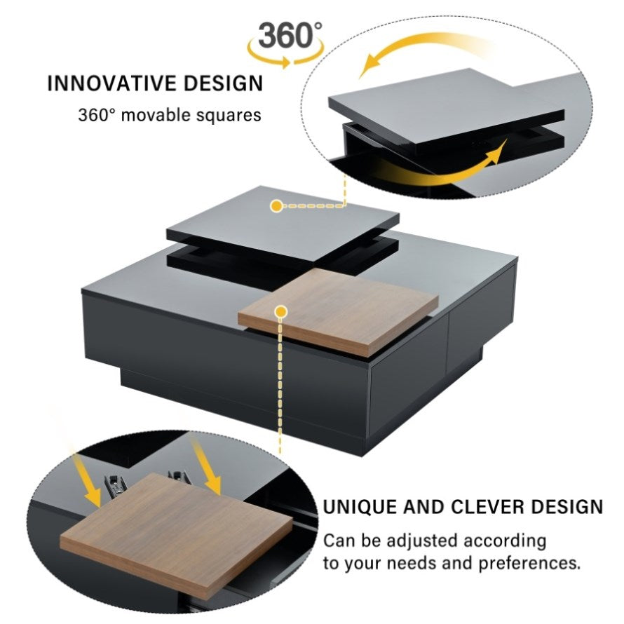 Movable Top Coffee Table, Modern Square Wood Coffee Table with High Gloss finish, 4 Hidden Storage 25494699
