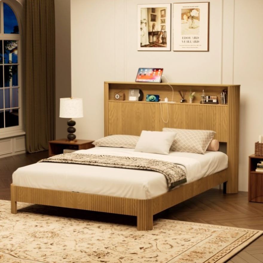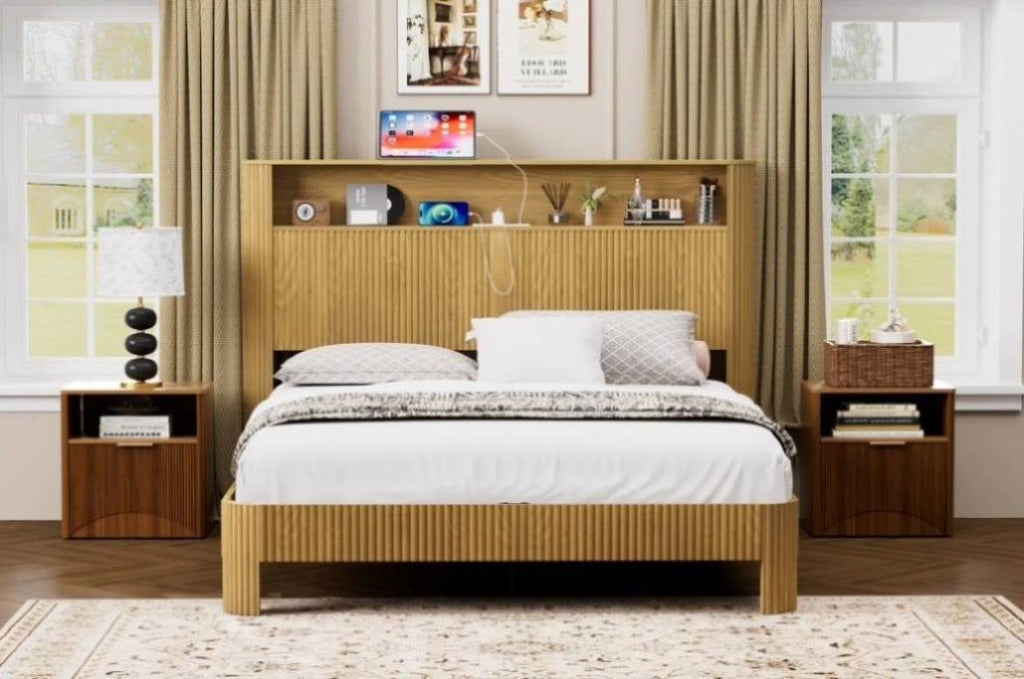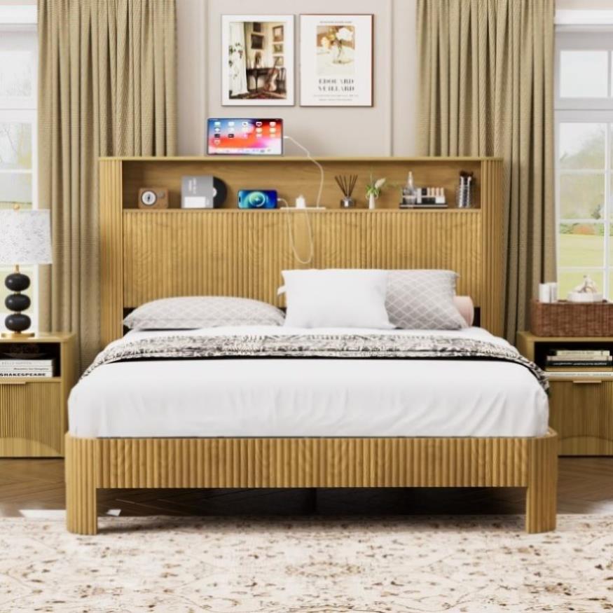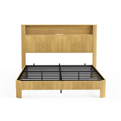 Queen Size bed frame with storage headboard, built-in charging station, wavy curved lines design, 02680710