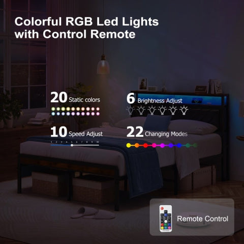 Smart RGB Led Bed Frame Full: This Led bed frame features with Led-lit headboard for ambient mood lighting and the combination of rustic-wood and metal accents for industrial appearance. It has much color to be choose from, can use the equipped remote control to set free easily. Change the led color to meet your needs of different styles and make the atmosphere more vivid! Also make your home life more colorful.
