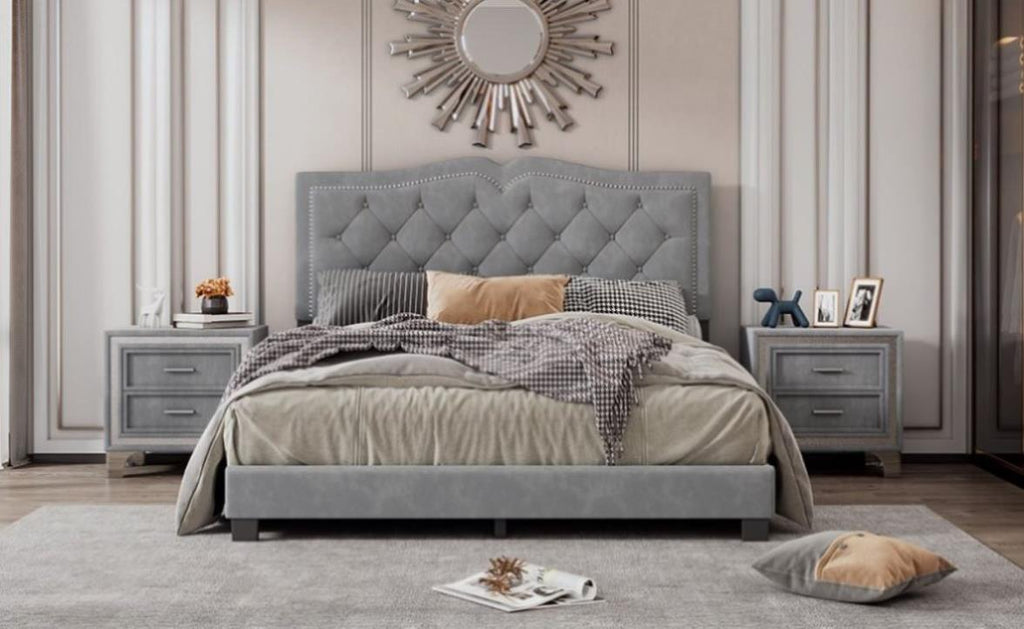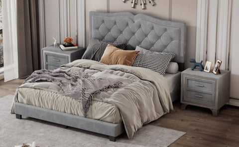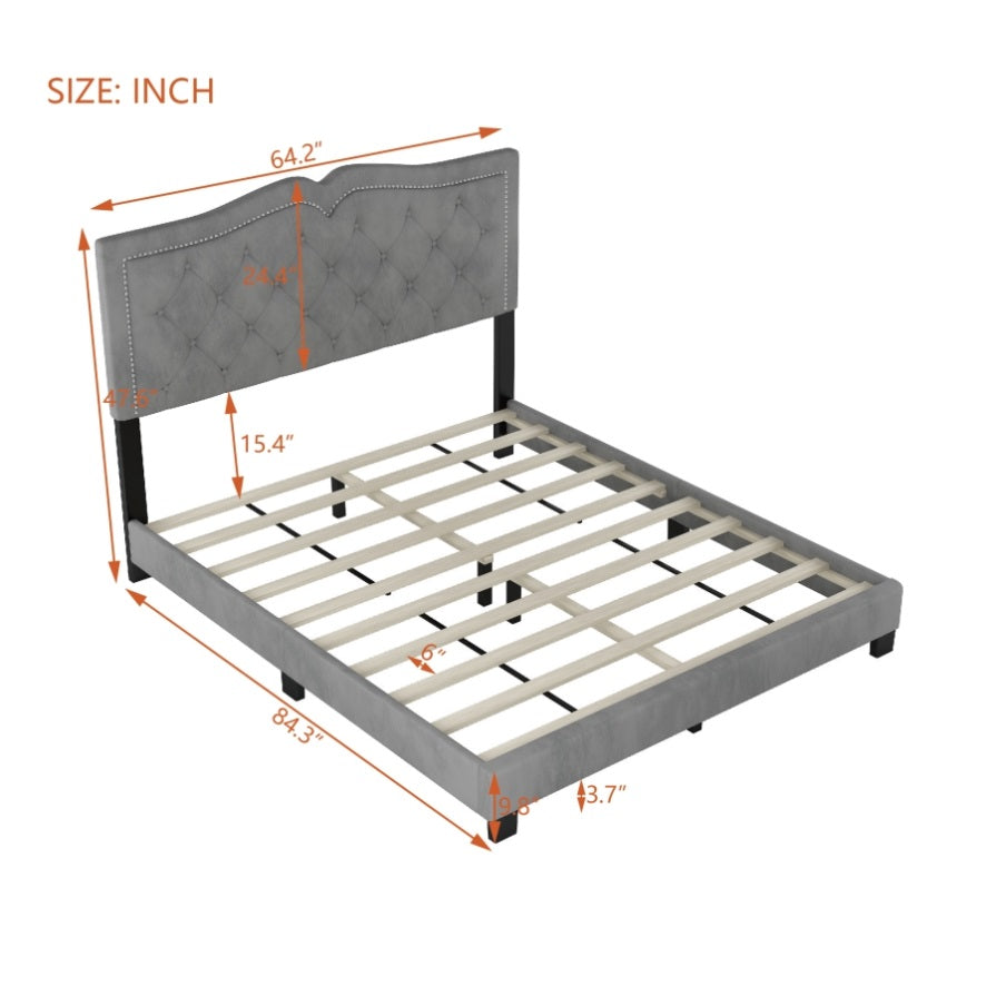 This Upholstered Platform bed features a plush velvet headboard with a charming tufted design, highlighted by a circle of decorative rivets placed elegantly along the outer edge of the tufting. These rivets add a touch of elegance and sophistication to the bed. This bed seamlessly blends comfort and modern flair. Sturdy wood frame construction and a wooden slat system to add extra stability and safety. Despite its size and solidity, this piece comes with hardware and instructions included and anyone can assemble it, without a problem.
