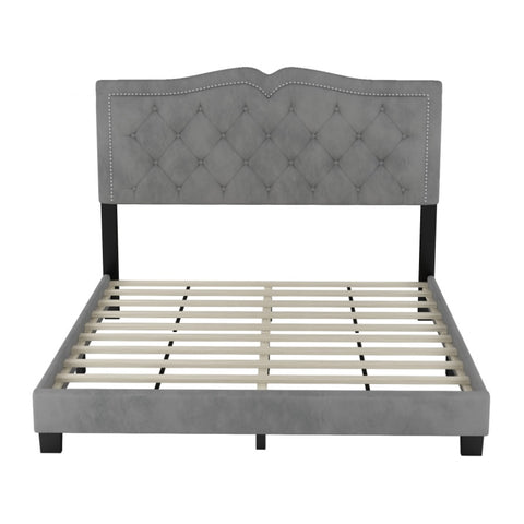 Queen Size Upholstered Bed Frame with Rivet Design, Modern Velvet Platform Bed with Tufted Headboard