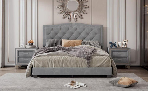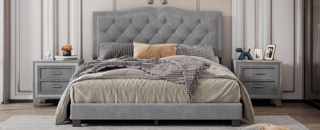 [Adorned with rivet accents] This Upholstered Platform bed features a plush velvet headboard with a charming tufted design, highlighted by a circle of decorative rivets placed elegantly along the outer edge of the tufting. These rivets add a touch of elegance and sophistication to the bed. This bed seamlessly blends comfort and modern flair.