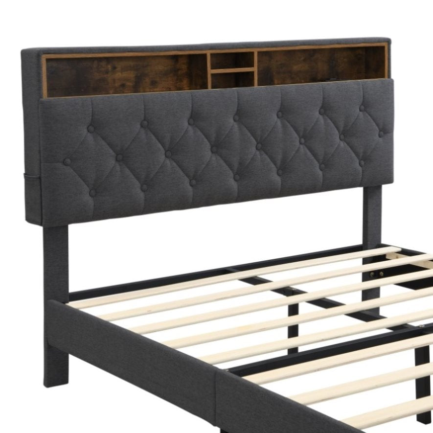 The bed headboard is built-in with 1 outlets and USB-Storage headboard with outlets that make charging ,this design solves the problem of your electronics running low on power while you're lying in bed, allowing you to charge your phone, tablet, headphones and other electronic devices within easy reach for everyday use.