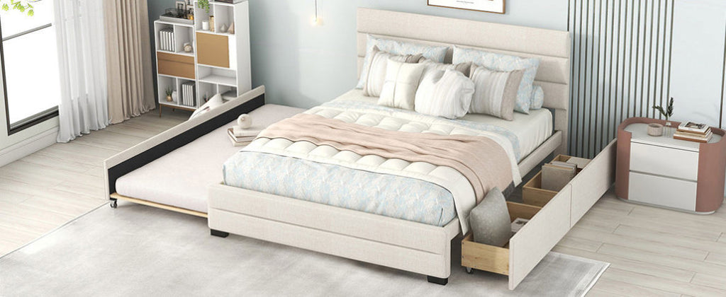 Queen Upholstered Platform Bed with Twin Size Trundle and Two Drawers, Beige