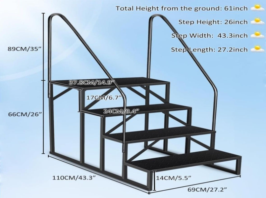 【Heavy Duty Portable Steps】The weight of 4 step (2 handrails) is 54.01 pounds, the capacity of our metal step is 660 pounds. With 1.8mm thickness iron anti-slip platform, the safety spa stairs is durable than wooden plastic or adjustable foldable. Hot tub stairs can withstand a lot of weight. We have made some load-bearing experiments, and many adults stand on the mobile home stairs, the step stairs are stable. Porch step for house outside is designed for small to medium-sized above-ground pools, backyard pools, and stock tank pools