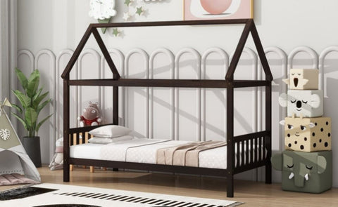 Twin House Bed with Headboard and Footboard, Twin Rubber Wood Bed with House Frame,Esspresso W504P225958