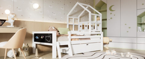 BOTH PRACTICAL AND CREATIVE: The bed is shaped like a loft window, which expands your child's activity space. The bed is paired with 2pcs 53.7*10 inches chalkboards at the end of the bed, which can be written on both sides, making it a cost-effective bed that combines entertainment and sleeping functions. The side of the bed comes with a star hollowed out decorative panel, the unique design allows you to add imagination and sense of fun to your child's bedroom.