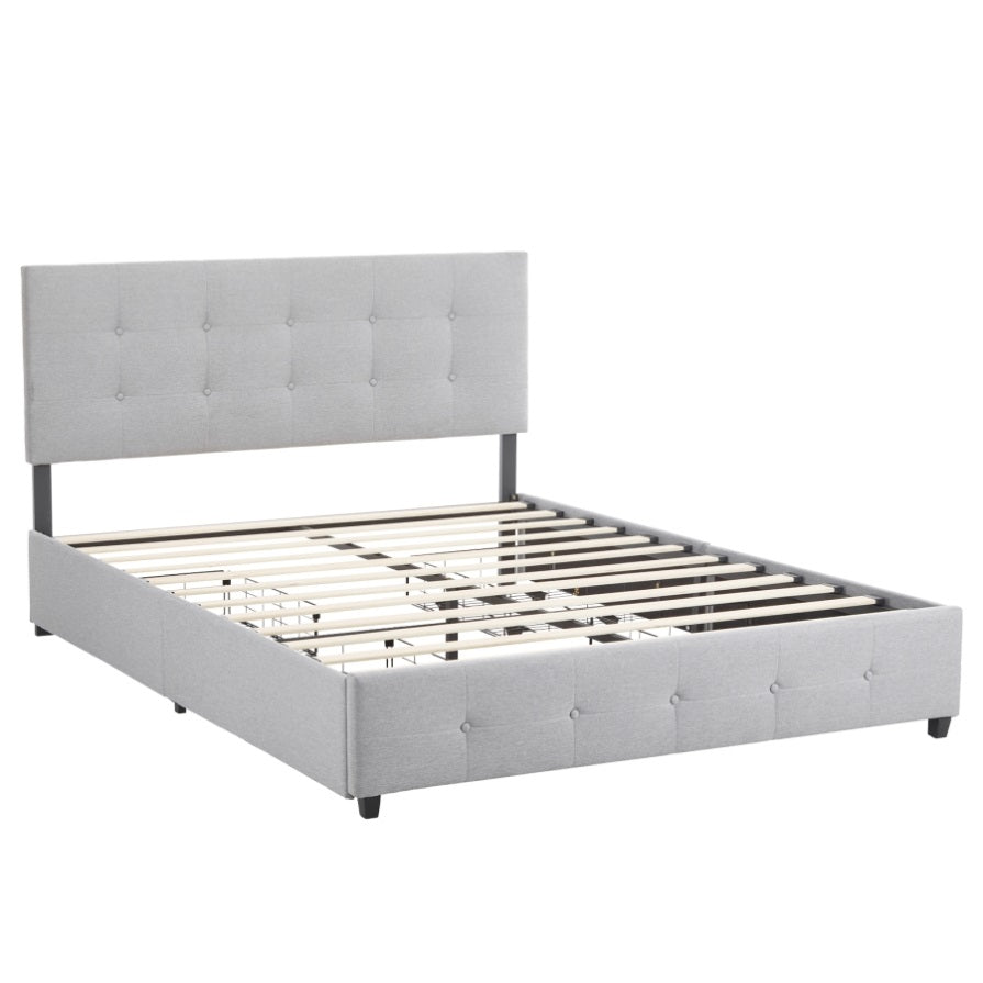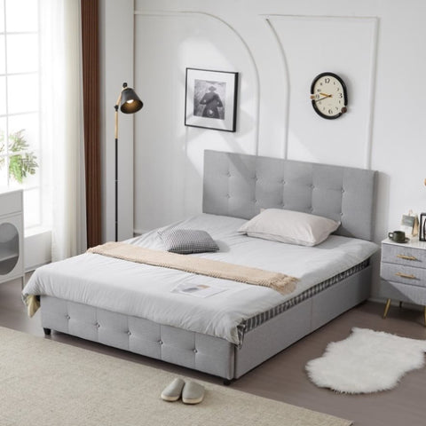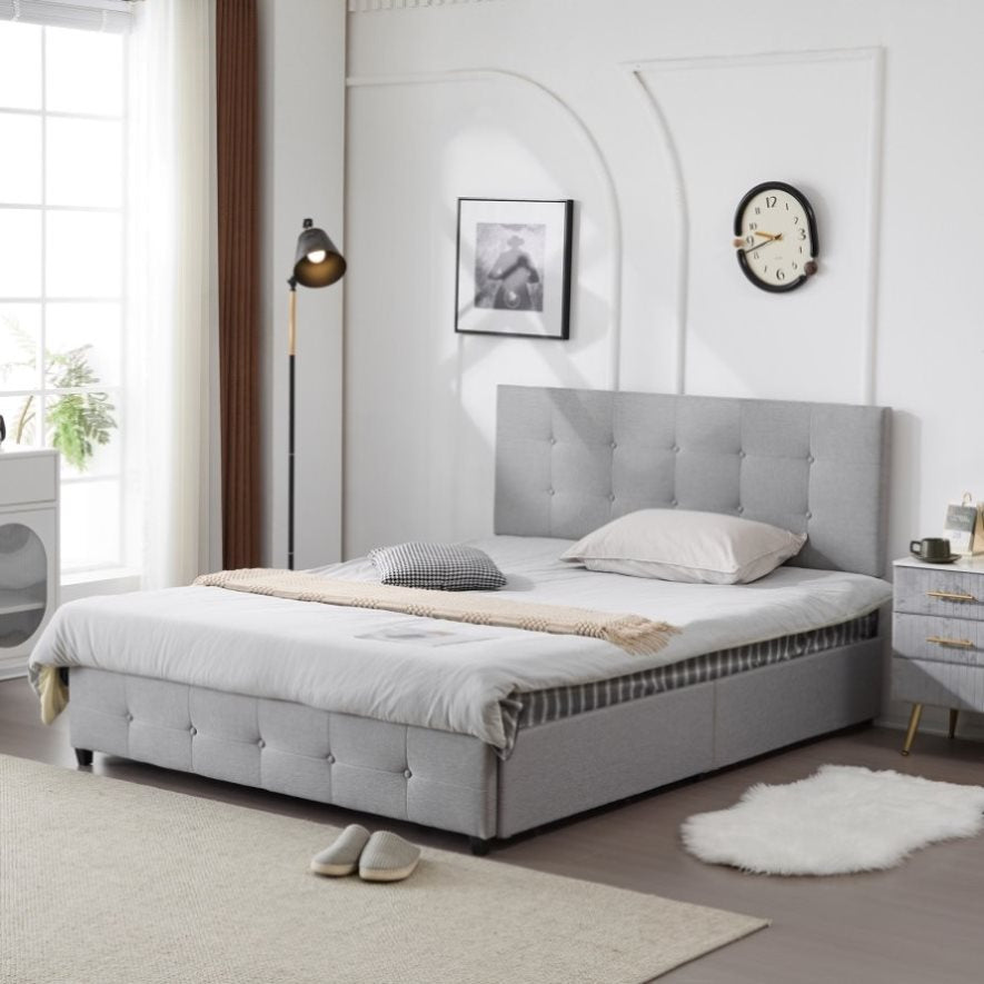 Upholstered in luxurious linen fabric with a button tufted headboard, this bed not only provides a sophisticated focal point but also offers the practicality of 4 spacious drawers for storing bedding, clothing, or accessories. The adjustable headboard adds flexibility to accommodate different mattress heights, and the sturdy wooden slat support ensures lasting durability without the need for a box spring.