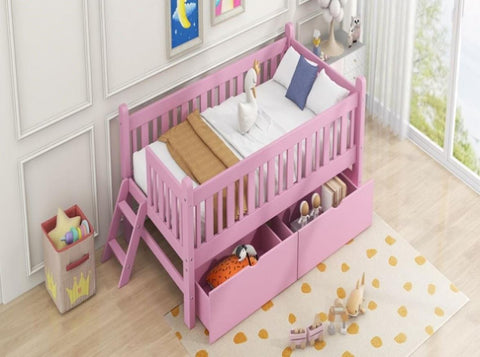Wood Twin Size Platform Bed with Guardrail and 2 Drawers, Pink